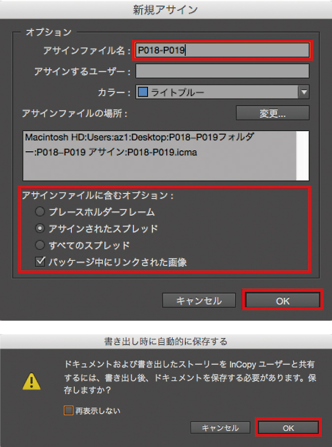 「ウィンドウ」メニュー→「アサイン」を選択してパネルを表示。InCopyで編集したいテキストボックスを選択したら「アサインの追加」→「新規」をクリックします。「新規アサイン」という画面が立ち上がるので「OK」を押します。
